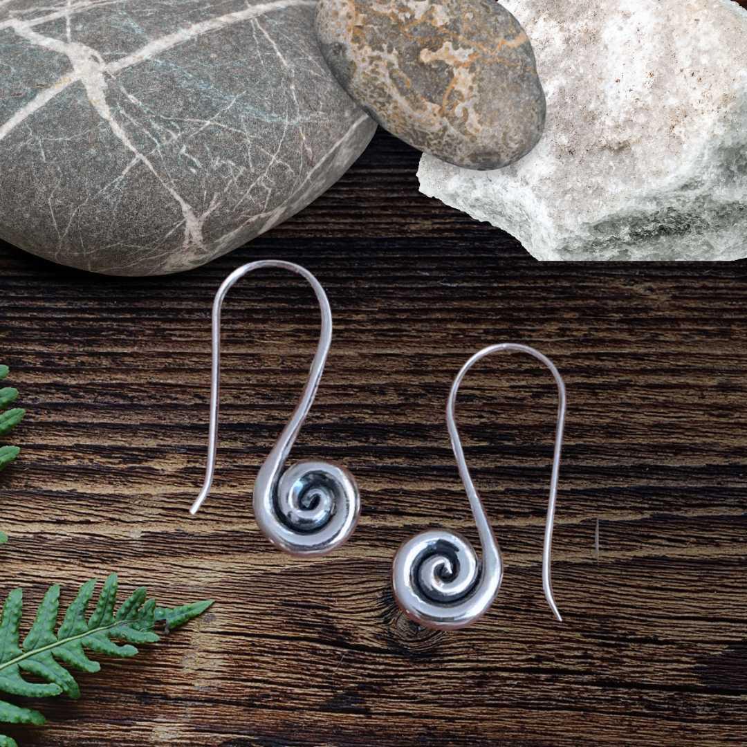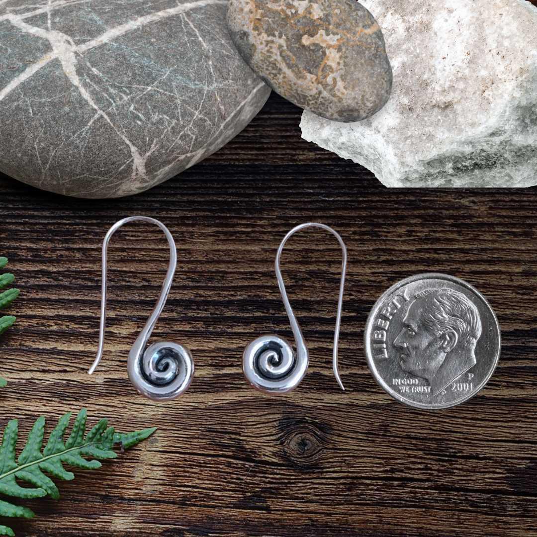 Sterling Silver Spiral Drop Earrings with a sleek, artsy swirling design that has a nice drop of almost an inch. A stylish choice for adding creative boho flair to any outfit.
