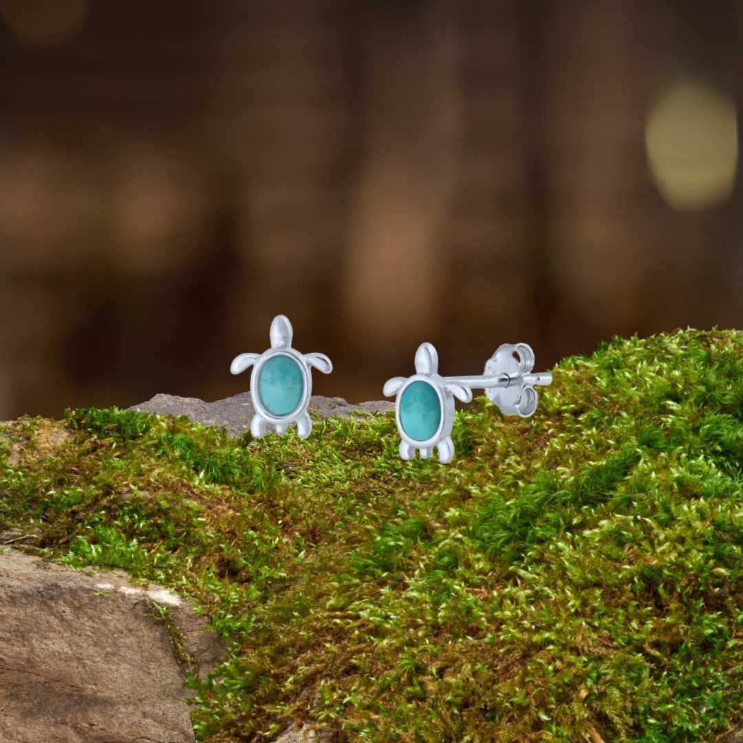 Bring a splash of the sea to your everyday style with our Turquoise and Sterling Silver Sea Turtle Stud Earrings. Crafted with care, each stud features a delicate sea turtle design made from polished sterling silver and accented with a genuine turquoise stone at the center — a nod to ocean waves and coastal beauty.
