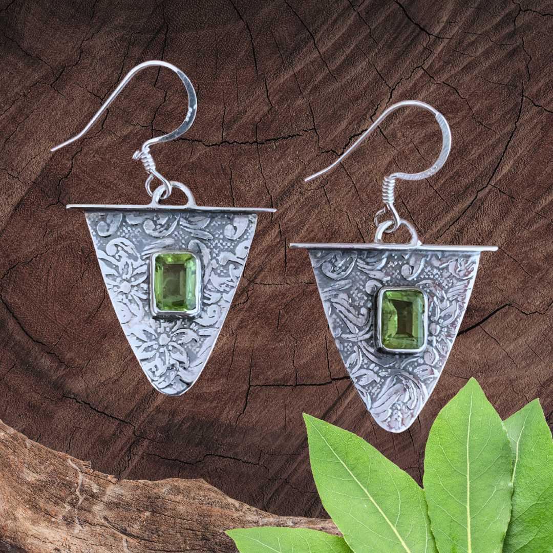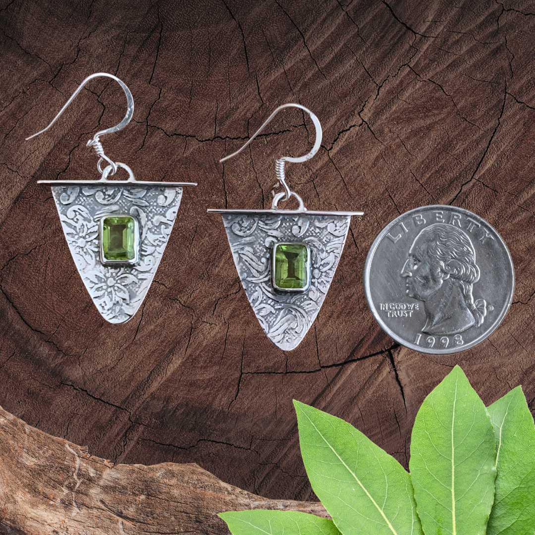 Add a unique mix of contemporary with vintage charm to your look with our Triangle Sterling Silver and Peridot Earrings. The rich green rectangular peridot contrasts beautifully with the detailed floral design in oxidized sterling silver, giving these earrings a timeless, antique-inspired appeal. A perfect gift for August birthdays or lovers of artisan style gemstone jewelry.