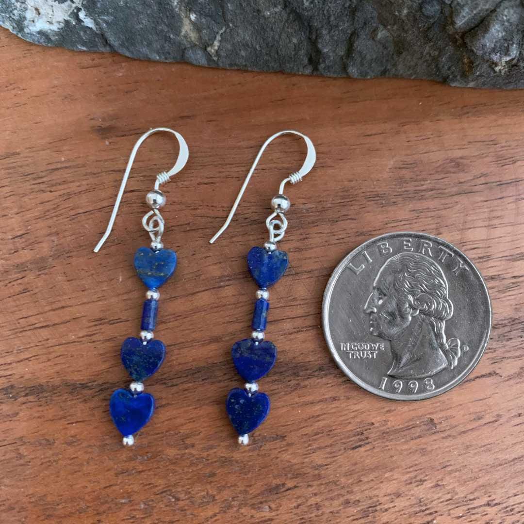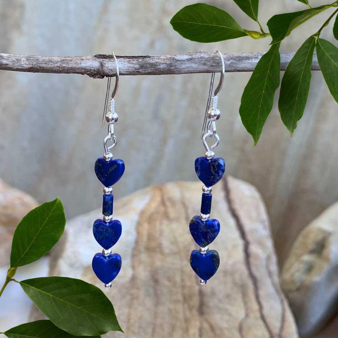Our Triple Lapis Lazuli Heart Beaded Earrings feature three delicate lapis hearts connected by a smooth lapis tube and accented with petite sterling silver beads for a refined finishing touch. Lapis lazuli is cherished for its rich royal-blue color and centuries-old association with wisdom, truth, and inner harmony, making it a meaningful gemstone to wear and gift. With their sweet heart motif and elegant dangle, these romantic earrings are a beautiful way to say “I love you” — a thoughtful and memorable Valentine’s Day gift.