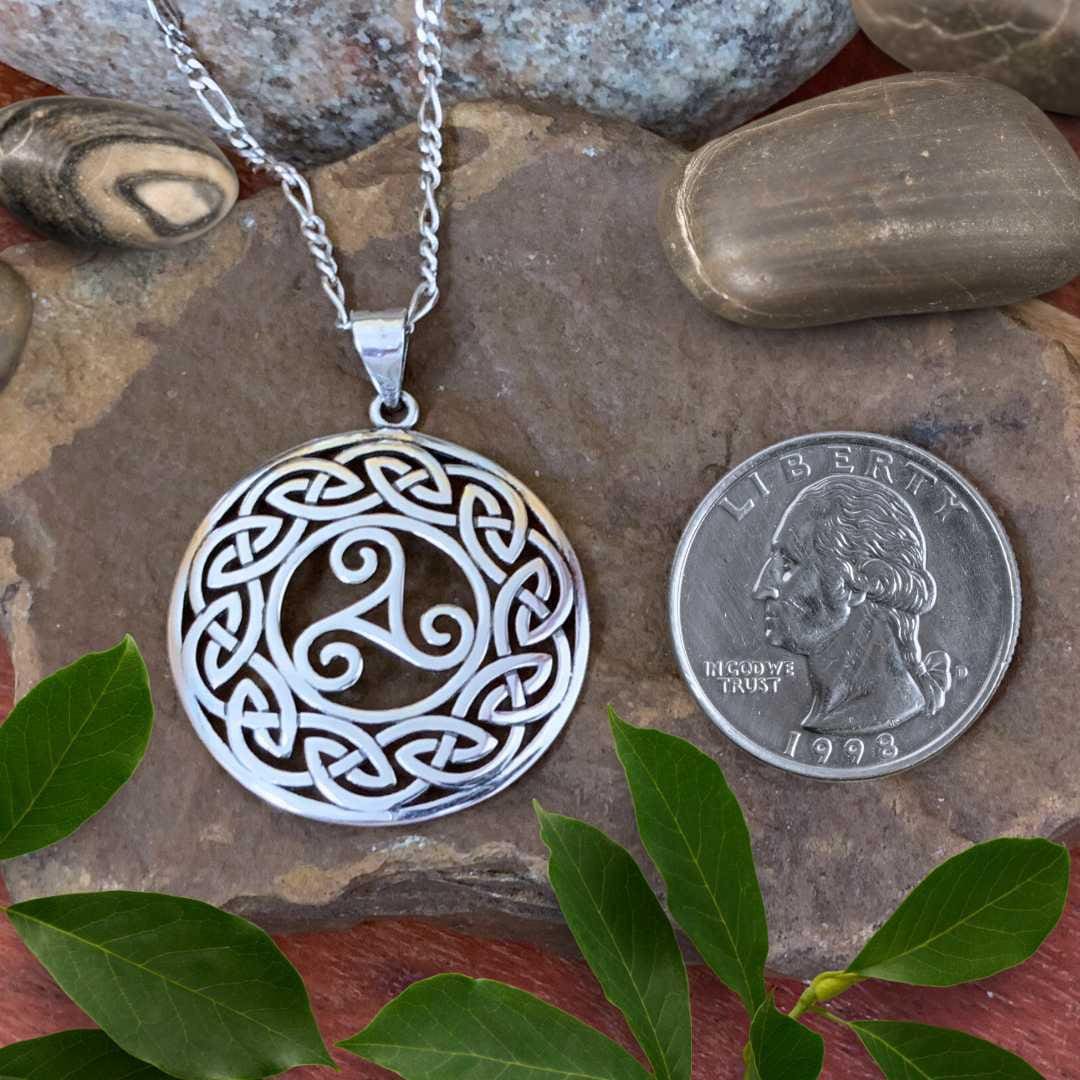 Our Round Triskelion in Celtic Knots Sterling Silver Pendant is a powerful symbol of motion, progress, and life’s eternal cycles. This pendant features the ancient Triskelion, a triple-spiral design, surrounded by intricate Celtic knotwork that represents eternity and interconnectedness. Crafted in sterling silver with fine detailing, it blends meaningful symbolism with timeless style. The Triskelion has been cherished for centuries as a representation of growth, spiritual development, and the harmony of body, mind, and spirit. A striking unisex piece for everyday wear or as a thoughtful gift for lovers of Celtic tradition.